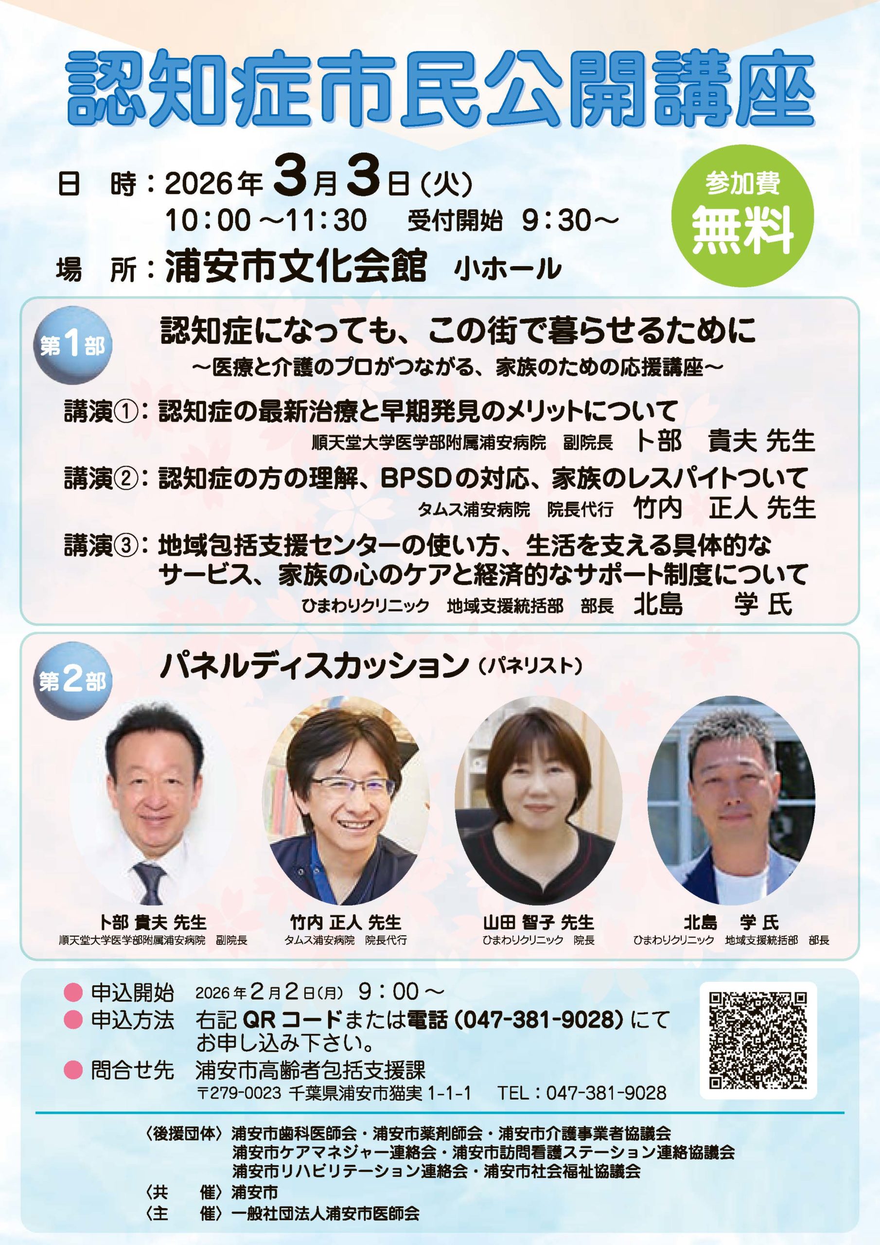 ひまわりクリニックの山田智子院長と地域支援統括部部長北島学が、浦安市医師会主催の市民公開講座に参加することになりました。今回の市民講座のテーマは「認知症と家族」。